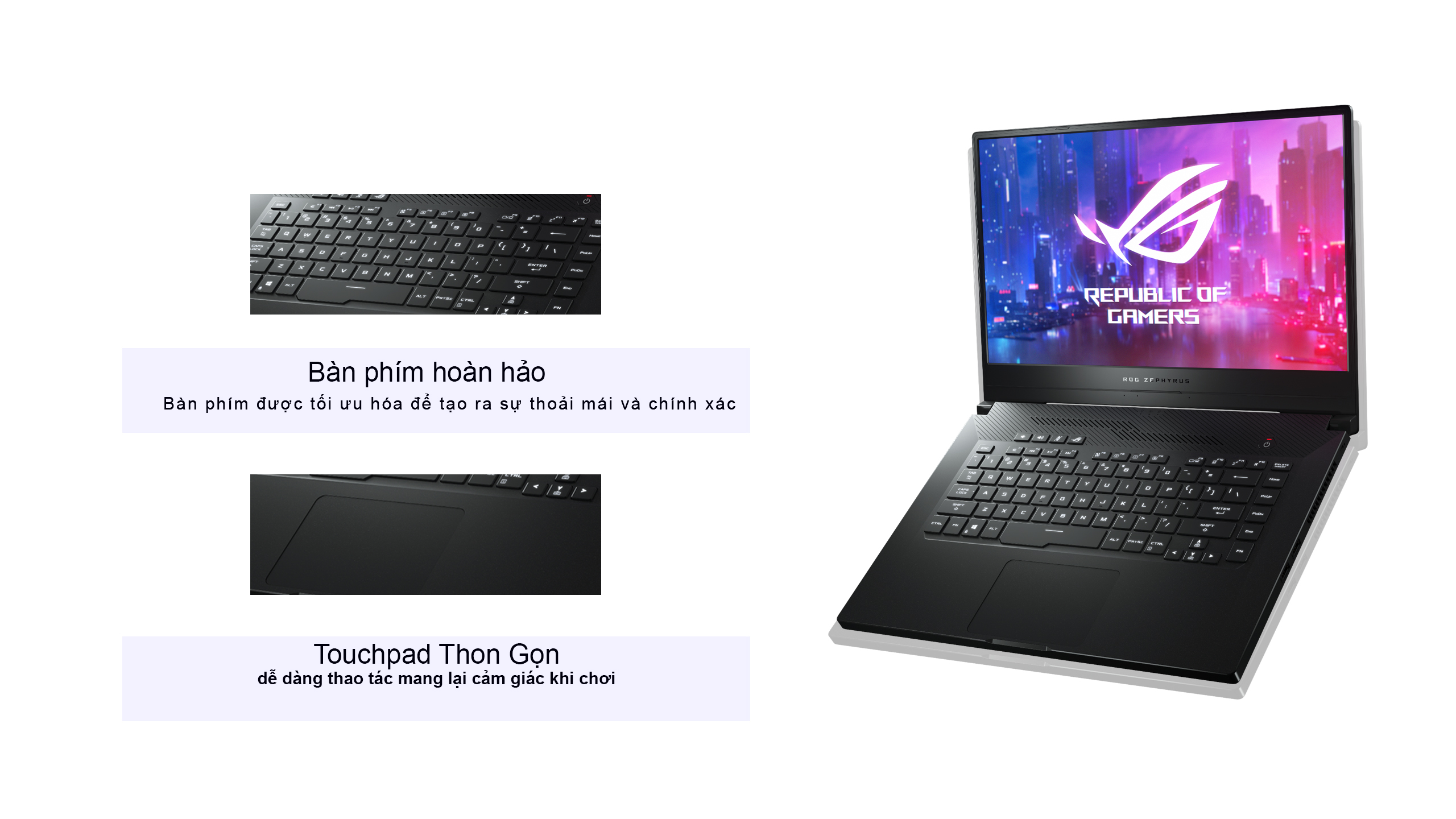 Bàn phím của của ASUS ROG Zephyrus G GA502 sẽ mang lại cho các game thủ sự thân thuộc với bố cục từ máy tính bàn. Ngoài ra còn tăng thị giác vào ban đêm cho các gamer với ánh sáng trắng tinh khôi nổi bật trên nền đen của bàn phím.